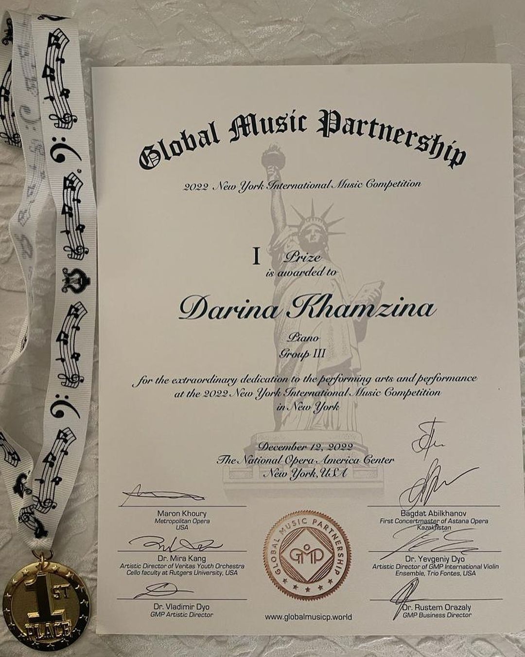 112 декабря 2022 г состоялся Международный конкурс «2022 New York International Music Gompetition»,который прошёл в г.Нью-Йорк. Студентка 3 курса Талдыкорганского музыкального колледжа им.К.Байсеитова отделения «Специального фортепиано»лауреат Республиканских и Международных конкурсов ХАМЗИНА ДАРИНА кл.преп.РАХИМХАНОВОЙ Г.К заняла достойное 1 место! Мы от души поздравляем нашу Дарину и педагога Гульзифу Кубатаевну с такой блестящей победой! Вы гордость своего отделения, своего колледжа, города и региона ЖЕТЫСУ! Мы вами гордимся и желаем достичь самых больших результатов, надеемся что в будущем будете участвовать на многих конкурсах и приносить славу нашему любимому колледжу!Спасибо вам за огромный труд, за ваши неоднократные достижения! Зрители с большим восторгом приняли исполнение Дарины.